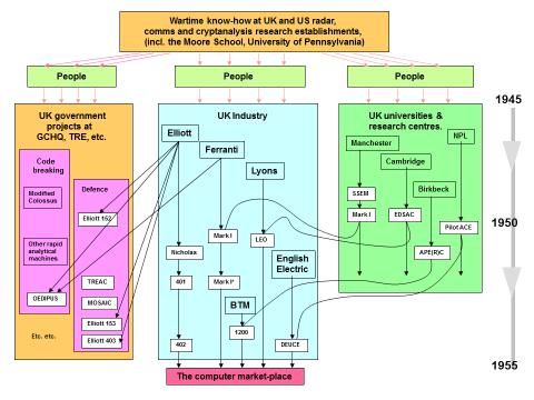 Most of the early UK and US computer projects benefited from wartime technological developments. Figure 3 shows the flow of electronic know-how within the UK from 1945 to 1955, by which time digital computers were firmly established in the market place. The labelled white boxes in Figure 3 represent nineteen early British computers.[9] All were of the stored-program type, except for OEDIPUS and the Elliott 152 which were adapted for special (classified) purposes.[10]