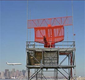 In 1943 U.S Air Force air traffic controllers began routinely using Ground Controlled Approach (GCA) equipment to help military pilots land safely in poor visibility. GCA employed a pair of oscillating radar antennas with narrow “pencil beams,” one scanning side to side (azimuth), the other up and down (elevation). A controller observed the precise angle returns from these azimuth and elevation radars and radioed landing guidance to the pilot. GCA also included a 360-degree rotating radar for surveillance of the entire terminal area. This radar used a “fan” beam (narrow in azimuth and tall in elevation) that detected planes out to about 20 miles from the airport and up to altitudes of about 3000 meters (10,000 feet).