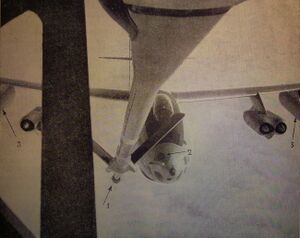 In the early years, refueling in flight was carried out via a flexible cable ending in a rubber ball weighed down by a lead ballast that slipped from the bottom of the tanker airplane. The purpose of the rubber ball was to make the end of the tube clearly visible to the pilot of the refueling plane, which in case of accidental contact with the propeller would not have damaged it. An operator equipped with a hooked rod leaned from the top of the cockpit of the aircraft into which the kerosene was to be poured, hooking the cable and manually inserting the sleeve into the tank.