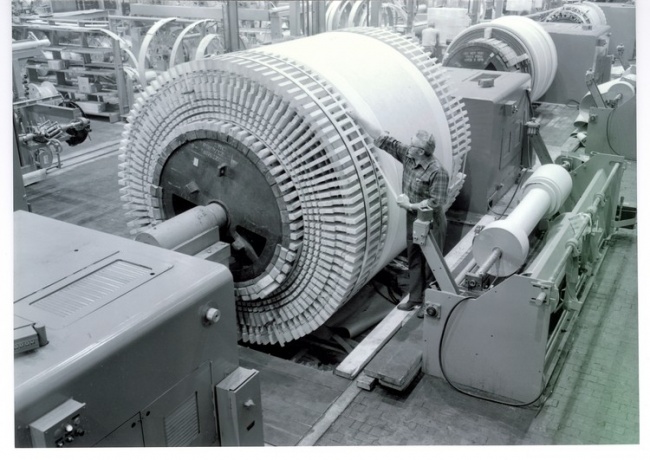 The original plant Power House dated from 1900 when the Stanley Company moved from Renne Avenue and Clapp Avenue in Pittsfield. The first generators installed were two-phase machines. By 1950, there were still a couple of two-phase generators (of later vintage) being held in reserve for emergencies. However, the active generation by that time was all three-phase. Over the years, phase-changing transformers had' been installed in some of the electrical substations around the plant to provide two-phase power to old motors still in use. As of today (1997), there are still one or two of these special transformers in use for this same purpose!