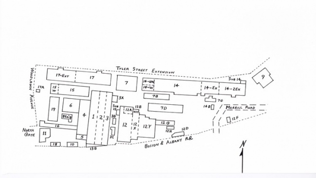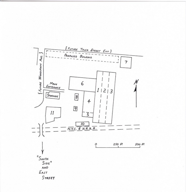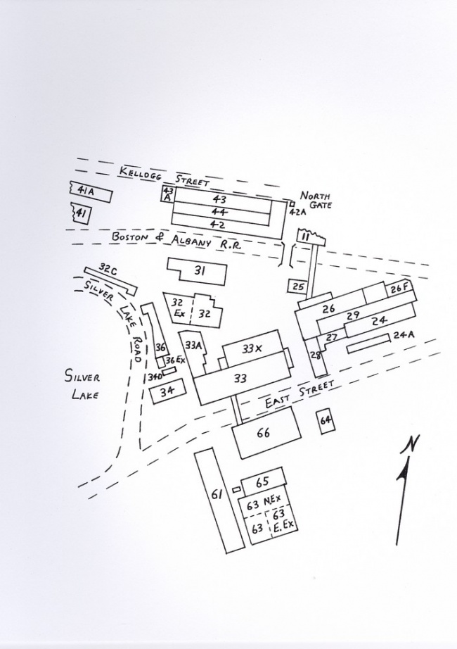 The preceding page shows the building layout of the plant in 1908, just after it became the Pittsfield G.E. Works. The area shown is that located north of the New. York Central and Hudson River Railroad tracks. This was actually the right-of-way for the Boston & Albany Railroad, which was owned by the NYC&HRRR. These tracks do still exist, and serve Conrail and Amtrak trains which run between Boston, Mass. and Albany, N.Y.