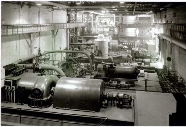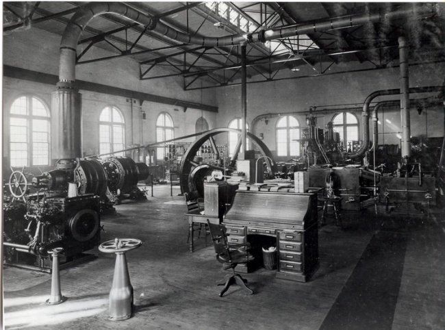 The two-phase generation and distribution voltage was originally chosen to be 2300 volts, and this was never changed through the years. In 1900, and for some years after that, all of the generators in the Power House were belt-driven from reciprocating steam engines. In later years, of course, the old engines were slowly replaced by steam turbines, and the generators replaced by more modern designs.