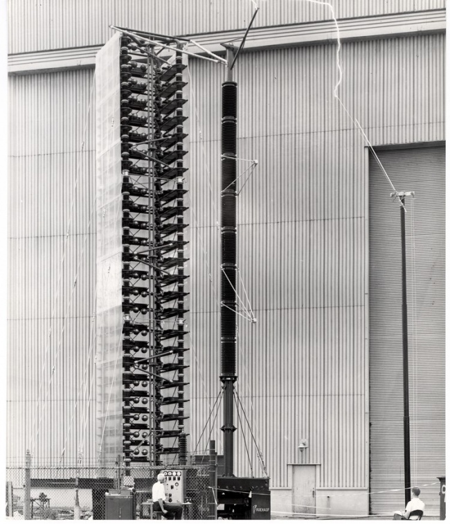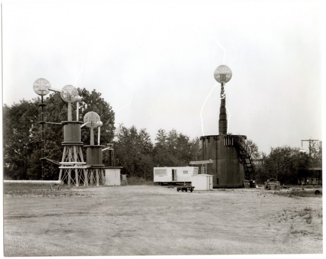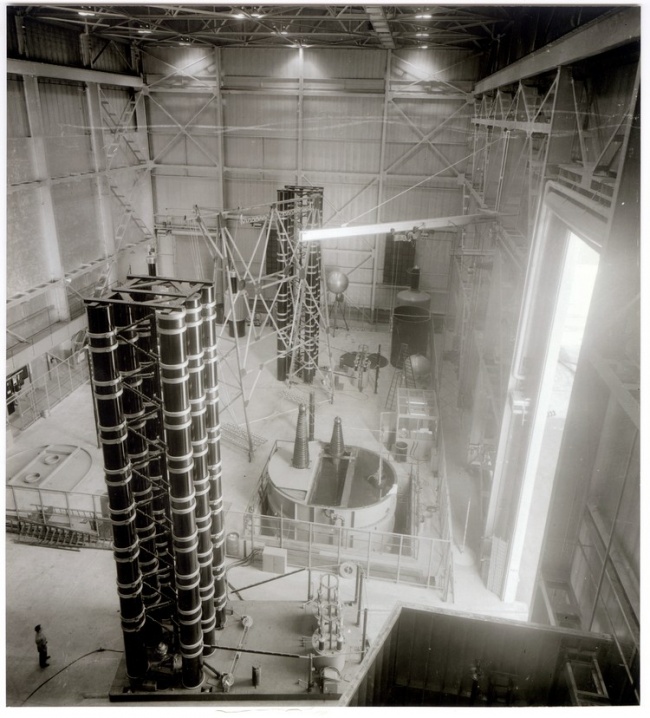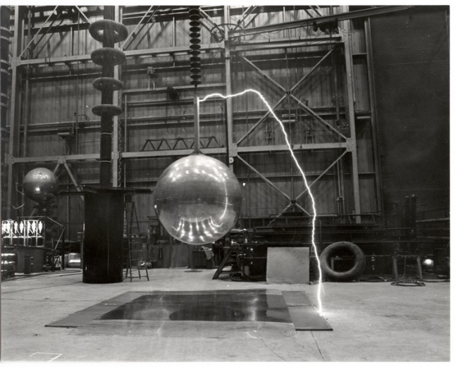 The "lightning bolts" were discharges from devices known as impulse generators. These giant stacks of capacitors allowed for the production of extremely high surge voltages which could be made to duplicate the surges created in electric power systems by natural lightning. Thus, the effects of these surges on electrical equipment could be studied in a laboratory environment.