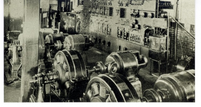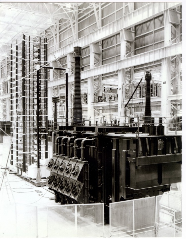 The High Bay section of the building is 165 feet long by 95 feet wide. The height to the roof trusses is 75 feet. A 25-ton bridge crane, which is 65 feet above the floor, was the longest span overhead crane of its capacity in the world when installed. One of the two High Bay impulse generators was mounted on an electrically-driven wagon, and could be moved outdoors for testing which required even greater clearances than were available inside. Tracks carried the wagon and generator through a fifty foot high rolling door which was the largest such overhead door in the world when installed. Power to operate cascade transformers located in the various test areas in the building was obtained from motor-generator sets in a room in the Low Bay section of the building. There was a 1000-Kva test alternator driven by a synchronous motor. This motor operated from the 13,800-volt, three-phase, 60-Hertz plant power system and the alternator it drove could supply only 60-Hertz power to the test areas. A second such synchronous motor drove a 500-volt D.C. generator which, in turn, supplied a D.C. motor driving two 500-Kva test alternators. This variable-speed link allowed these two alternators to supply frequencies other than 60-Hertz if necessary (such as 25-Hertz or 50-Hertz). The Low Bay test areas occupied the three-storey high eastern end of this section of the building. It was served by a 10-ton capacity overhead crane. The first and second floors of the western section housed offices, shops, and darkrooms. The third floor was occupied by offices and test areas for lightning arrester development work. The two-storey high motor-generator room was also in this section, as was the two-storey climate-controlled test area ("Area 5").