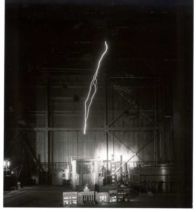 "Julius H. Hagenguth, engineer in charge of the laboratory, supervised the firing of artificial lightning more than fifty feet through the air in the huge demonstration hall of the laboratory, described as 'the world's largest man-made lightning center'."