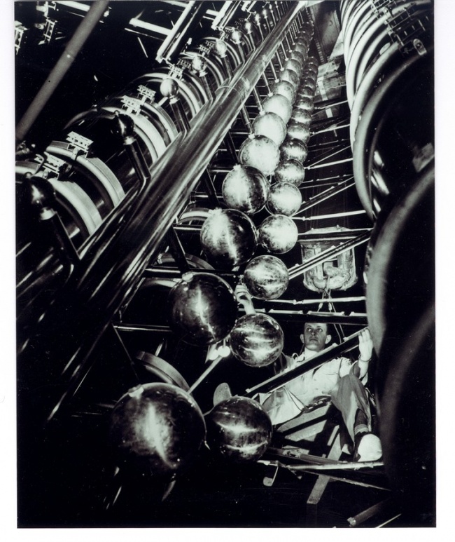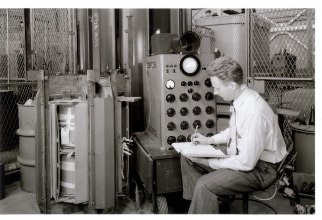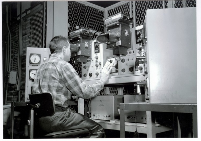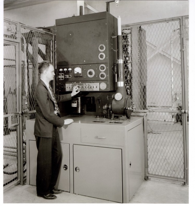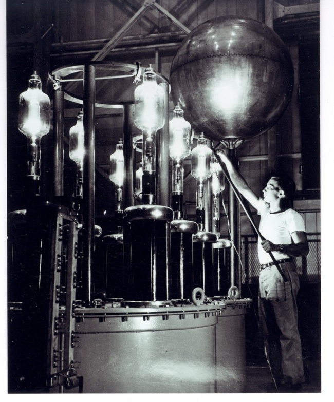 When Building 9 was constructed in 1949, the lightning arrester development group was given space on the third floor. They used a Dufour-type "cold-cathode" oscillograph in their work for many years. Tom Carpenter, an engineer who joined this group in 1937 and retired in 1976, was an expert in the operation of this device.