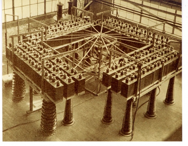 Steinmetz died shortly thereafter, in 1923. However, his work with high surge currents was continued in Pittsfield. In 1934, a high current generator was constructed which was capable of producing discharges of 265,000 amperes at a voltage of 50-kv. It used a group of capacitors totaling about fifty microfarads arranged in a hollow square configuration. The test piece (the object which was to receive this blast of current) was placed in the center of the arrangement.