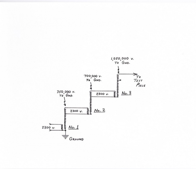 Ultimately, special testing transformers known as "cascade transformers" were developed in order to obtain extremely high power frequency (usually 60-Hertz) voltages. This technique involved the use of two or more transformers connected in "cascade" so as to add their individual voltages together.