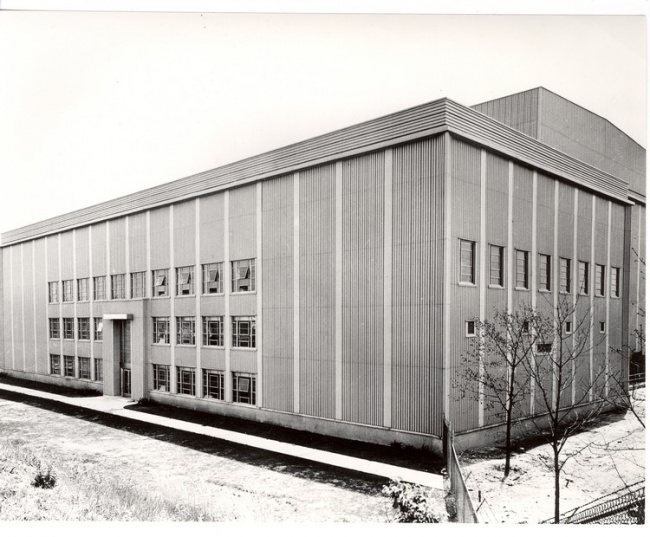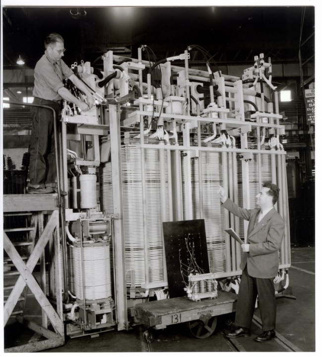The "demonstration hall" referred to above was the "High Bay" area of the new Building 9, located on Tyler Street Extension, in the Pittsfield G.E. plant. This building still stands today, but is essentially abandoned as a result of the closing of the Pittsfield transformer operation in 1987. The building is distinguished by an aluminum and glass block main entrance facade in the Art Deco style which was still in vogue at the time of its construction in 1948-49.
