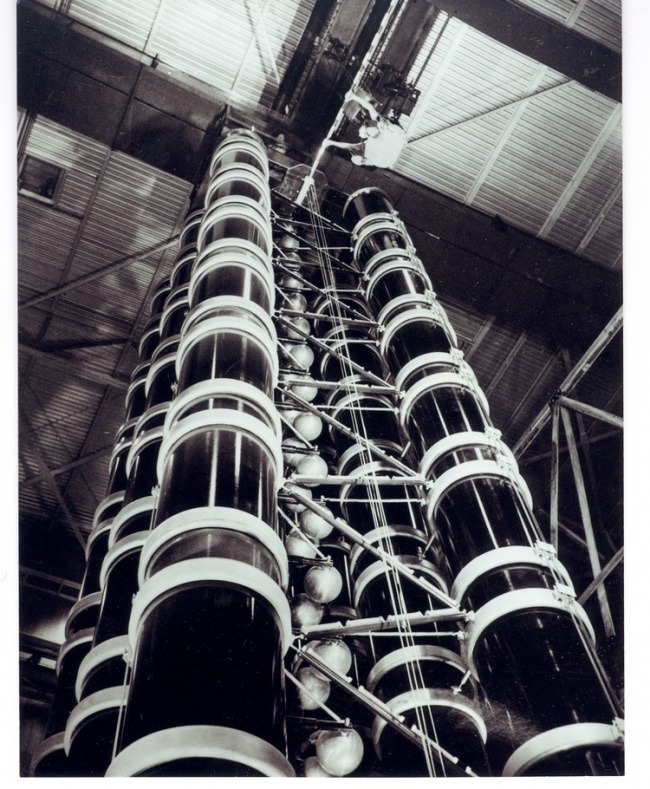 An impulse generator was designed for Area 72 which. featured an enclosed inner stack for protection against the weather. Dry, filtered air was blown up through this stack in order to maintain the ability of the generator to withstand the high voltages produced during its operation. Originally, the generator was designed to be able to produce discharges of up to 7200-kv. However, it was never actually built up higher than was necessary to produce an output of 5000-kv. As such, however, it stood eighty feet tall and was braced to withstand a wind load of up to 75 miles per hour.