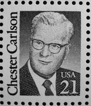Chester Carlson was honored with the printing of a 21 cent stamp, which was issued first on October 21, 1988. He was knows as the "Father of Xerography" (see image to the right).