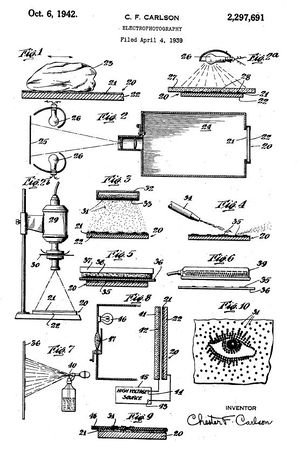 The idea of xerography only came to Carlson while he was taking law courses. The Great Depression was not the best time to graduate from college. There was an over abundance of physicists, many of whom had higher degrees than Carlson. He used his technical training to get a job in the Bell Labs patent department, after which he moved on to the patent department of the electrical and electronic manufacturer P.R. Mallory & Company. Carlson then thought it wise to get a law degree. But all during this time, he still harbored a deep desire to invent something great. While copying text from law books that he could not afford to buy, Carlson's inventive desires naturally turned to finding an easy way to duplicate documents. Convinced that photographic techniques using chemicals would not work, he looked for a new angle. His Cal Tech degree would now serve him well. He started to study the work of other physicists in search of a phenomenon that could serve as the basis for a new copying technique. He then came upon photoconductivity which deals with the conductive properties of materials when subjected to light. On 8 September 1938, he filed for a patent on "Electron Photography" and was granted patent # 2,221,776 on 19 November 1940.