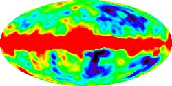 COBE was launched in November 1989 and enabled the microwave background radiation spectrum to be measured about 1000 times more precisely than was previously possible. [In July of 2001, the Microwave Anisotropy Probe (or MAP) satellite was launched to find out more about cosmic microwave background with even more precision than COBE]. The data collected by COBE showed that the cosmic microwave background has an intrinsic anisotropy of the order of 1 part in 100,000. In other words, the measured intensity (or “temperature”) of the radiation does not have the same value in all directions, but varies very slightly from place to place. These tiny variations in the intensity of the cosmic microwave background over the sky show how matter and energy were distributed when the universe was still very young.