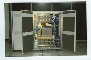 To cool the CPU air was forced on to the processor chips by using a plenum that was designed to cover each chip. Holes were designed in the plenum such that equal operating temperature would result for each operating chip. Since the power consumption variation significant for several part types, designing the appropriate number of holes above each chip location could provide custom cooling. The plenum could then be molded for mass production of the processing unit. Large volume cooling fans were designed for the system as well. Cost was the focus for the air-cooled systems since the price tag was below $1M. Recall, that the air-cooled design was identical in parts at the CPU and storage level. A single development was achieved for a wide range of products with one design team.