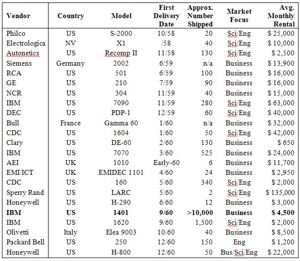 - 1959, IBM announces transistorized 1401 Data Processing System