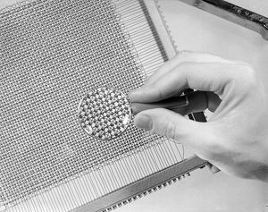Up until this time, magnetic-core arrays were predominately hand assembled by women who deftly threaded hypodermic needles through selected cores, requiring forty hours per array. Because the SAGE installations would need tens of millions of cores, IBM built a core threading machine and a facility that could fabricate and test half a million cores per day.