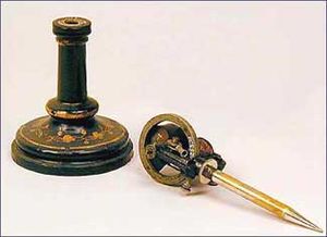 Edison’s mechanized stencil making with the electric pen. He developed a tiny electric motor, but rather than a rotating motor, he used an oscillating motor that moved up and down at high speed. He connected this motor to a hollow tube, which the writer held. A sharp stylus ran through the tube. By tracing letters, the electric pen produced a stencil at high speed but without tearing up the sheet. The first words etched by the pen were "Now is the winter of our discontent," from Shakespeare’s Richard III, Edison's favorite play.