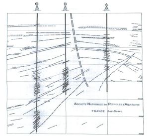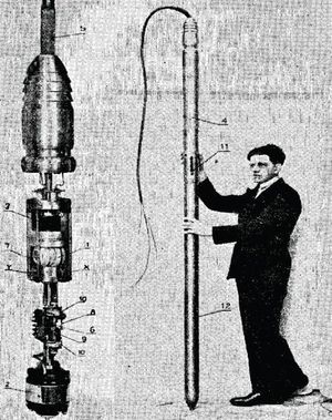 The functioning of the electromagnetic teleclinometer is based on the use of an induction compass moved by an electric motor and of an electromagnet supported by a cardan suspension[2] whose magnetic field influences the coil of the compass in proportion to the inclination. The apparatus, whose diameter was 10 cm. (3.9 inch), comprised of three insulated conductors, was lowered into the well bore by means of a cable, and the measurements were recorded at the surface with a potentiometer.[3] The measurements were extremely rapid, lasting less than a minute at each point, so that 1000 meters (3280 feet) of drill hole could be surveyed in about an hour. The measurements were accurate to within half a degree. The dipmeter[4] was an improvement on the teleclinometer, which was built by adding to the latter an extension comprising a pole for sending current into the ground, and measuring electrodes. It did permit the measurement of the equipotential surfaces induced by the passage of the current, from which can be deduced the direction of the dip of the beds in relation to the magnetic North.