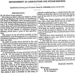 Eventually, McCoy established his own firm, which received 57 U.S. patents-- 28 of which he held himself. Most of McCoy's patents dealt with lubricating devices. His first invention, a lubricator for steam engines built in 1872, became perhaps his best known. This invention enabled machines to remain in motion while they were being oiled, making them more reliable and less prone to catastrophic failure.