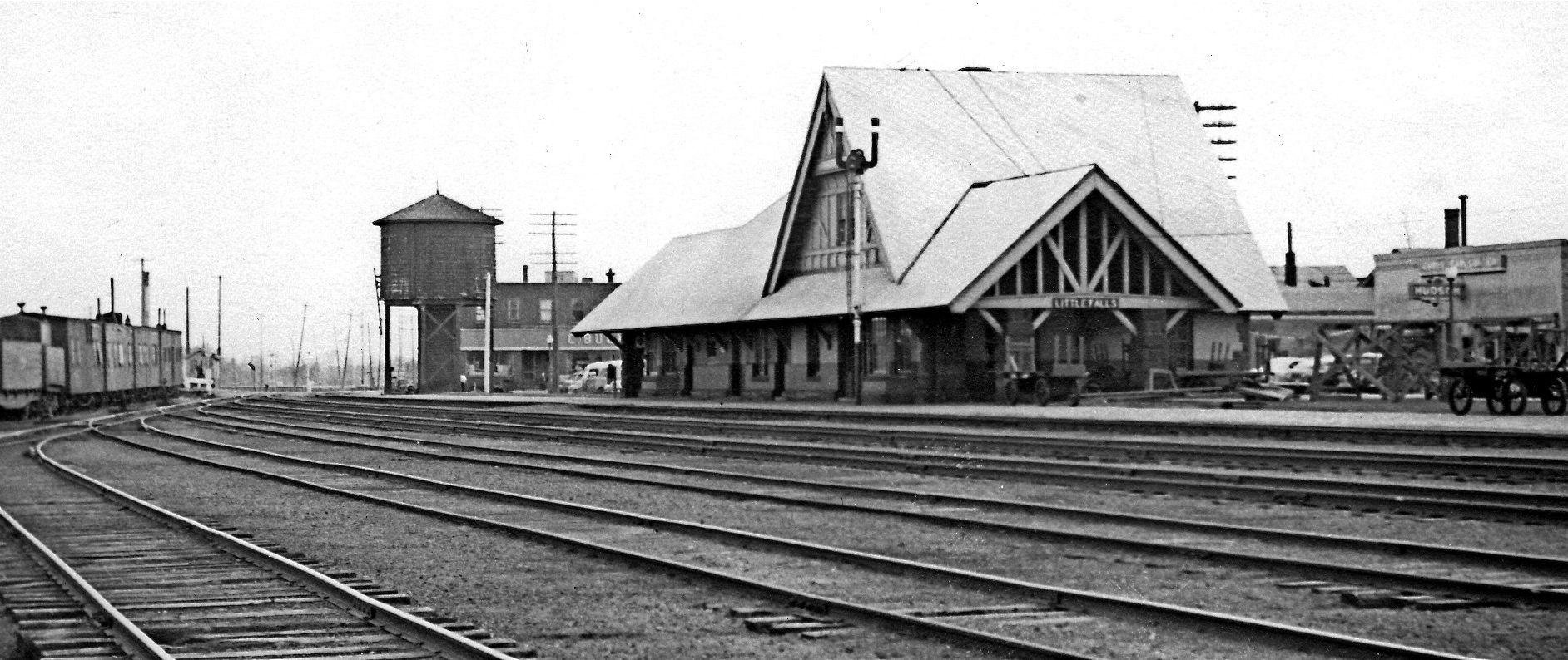 The Little Falls, Minnesota, Northern Pacific railroad station at the end of a pleasant one-day train ride from Forsyth, Montana, 1945. Photo by the author