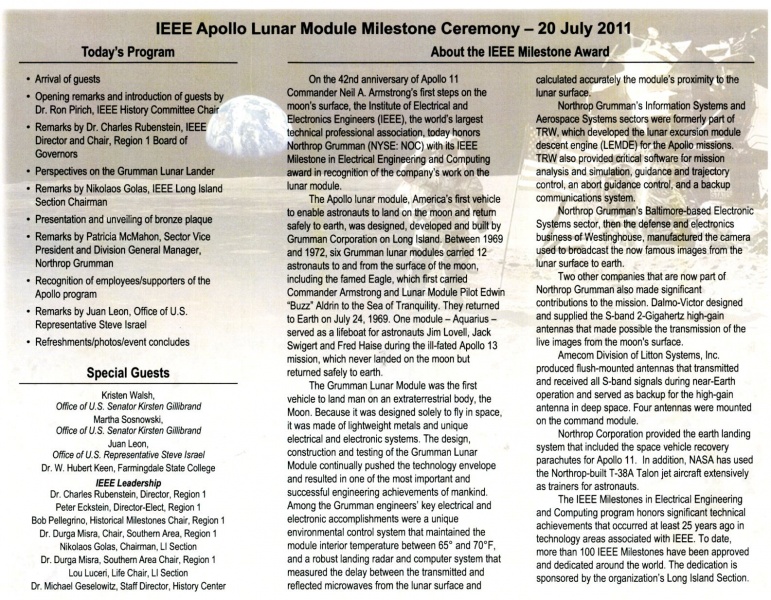 Back page of Grumman Lunar Module milestone ceeremony brochure 20 July 2011