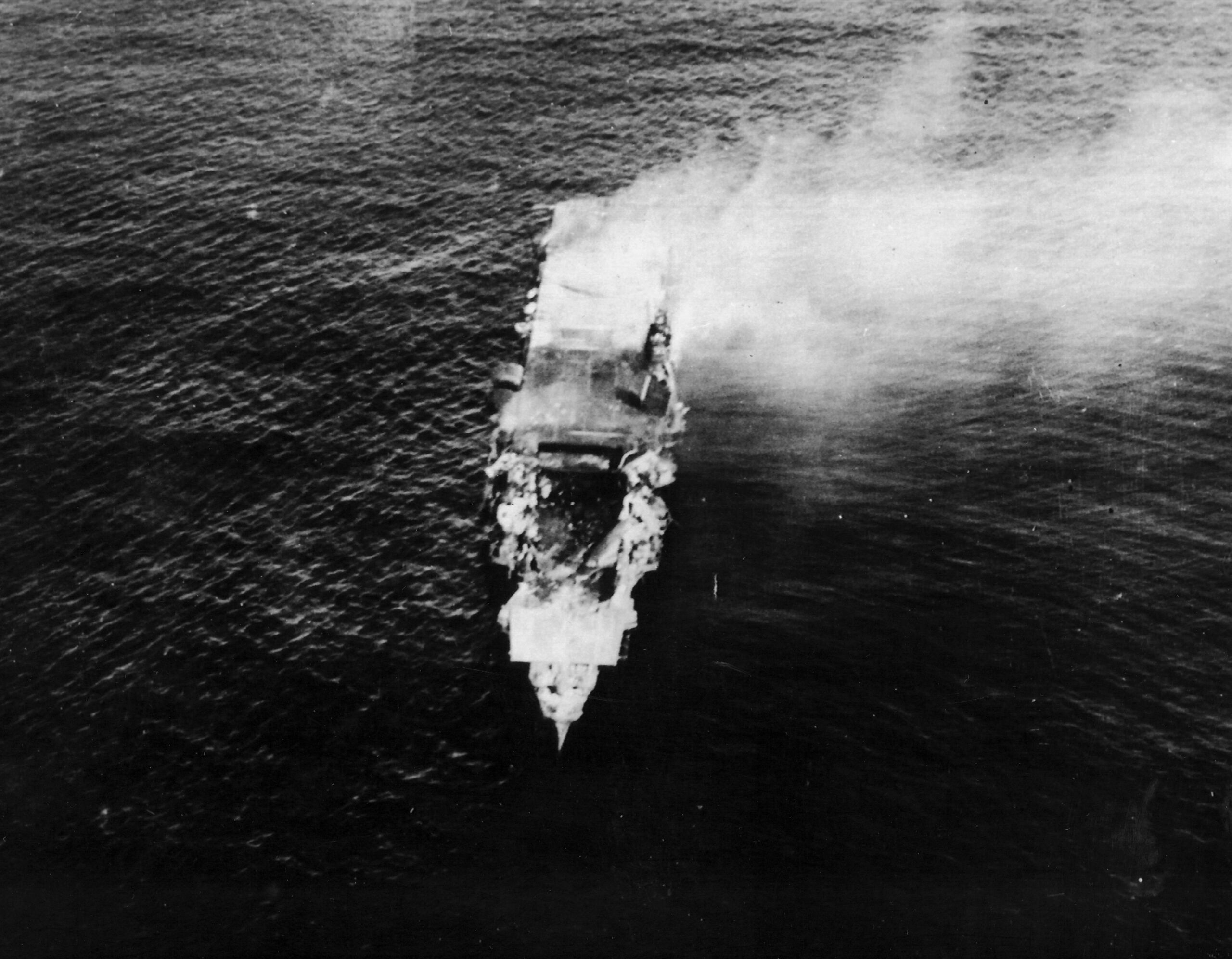 The burning Hiryu on the morning of 5 June 1942 with a large hole in her flight deck. The carrier was sent under by a Japanese torpedo about four hours later. Naval History and Heritage Command photo NH 73065 (Donation of Kazutoshi Hando, 1970)