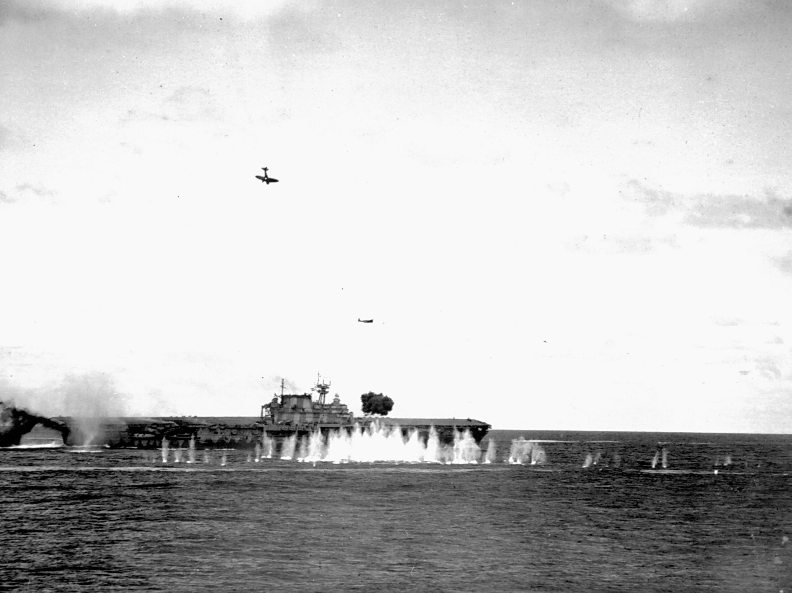 USS Hornet under attack during the Battle of the Santa Cruz Islands. The Aichi D3A1 dive bomber headed straight down has been hit and will bounce off the smoke stack onto the flight deck. A Nakajima B5N2 torpedo flying over the carrier has just dropped its torpedo, and the balck puff is an exploding AA projectile. The splashes in the foreground are from shell fragments. Naval History and Heritage Command photo 80-G-33947