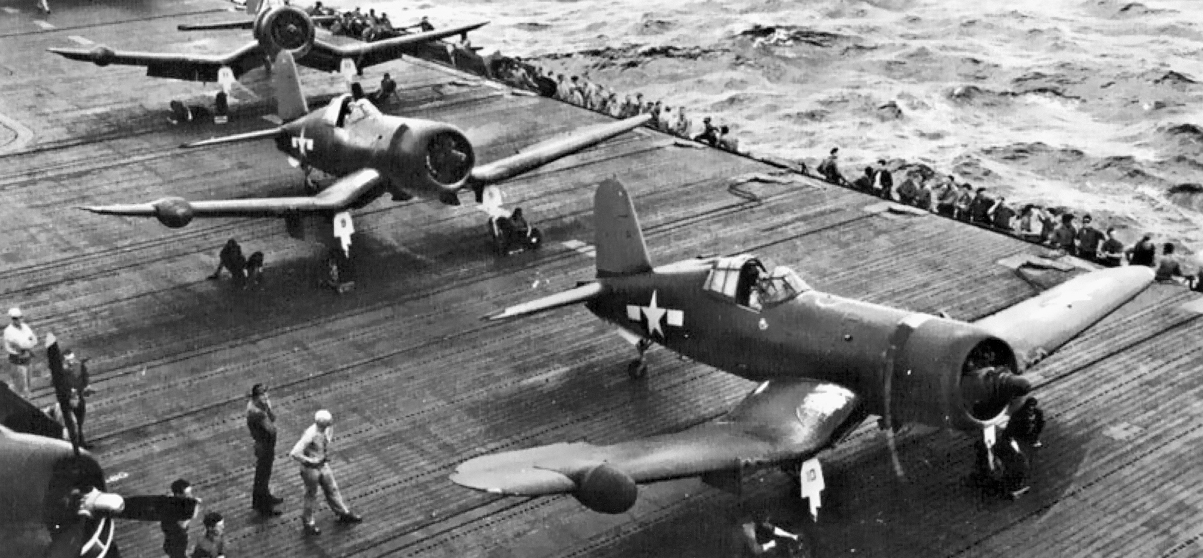 Vought F4U-2 Corsair night fighters of Night Fighter Squadron VFN-101 abaord the carrier Intrepid in early 1944. A four-plane detachment of the squadron was assigned to Intrepid. The AN/APS-6 radar can be seen mounted in a housing on the right wing. U.S. Navy photo from the USS Intrepid (CVS-11) 1971 cruise book