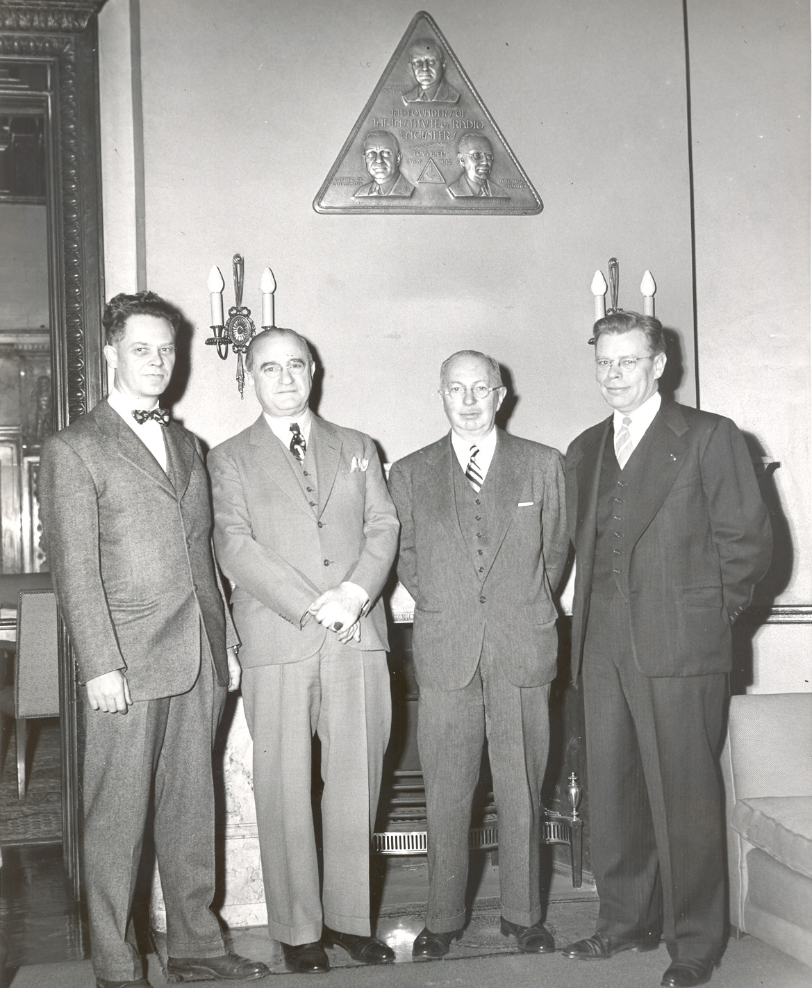 Dedication of IRE founders plaque (featuring Robert H. Marriott, Alfred Goldsmith, John V. L. Hogan), 1952. L to R: IRE Pres. Donald B. Sinclair, Alfred Goldsmith, John V. L. Hogan, and James W. McRae.