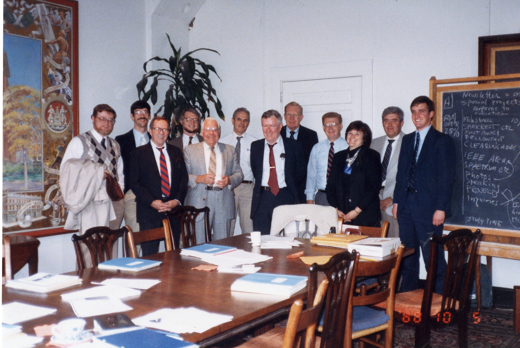IEEE History Committee Meeting, October 5, 1988. Members of the committee standing behind the meeting table. L-R unknown, Robert Friedel, unknown, Ron Kline, Charles Wright, Barney Finn, Jim Brittain, John Bryant, Warren Seamans, Joyce Bedi, unknown, Craig Semsel.