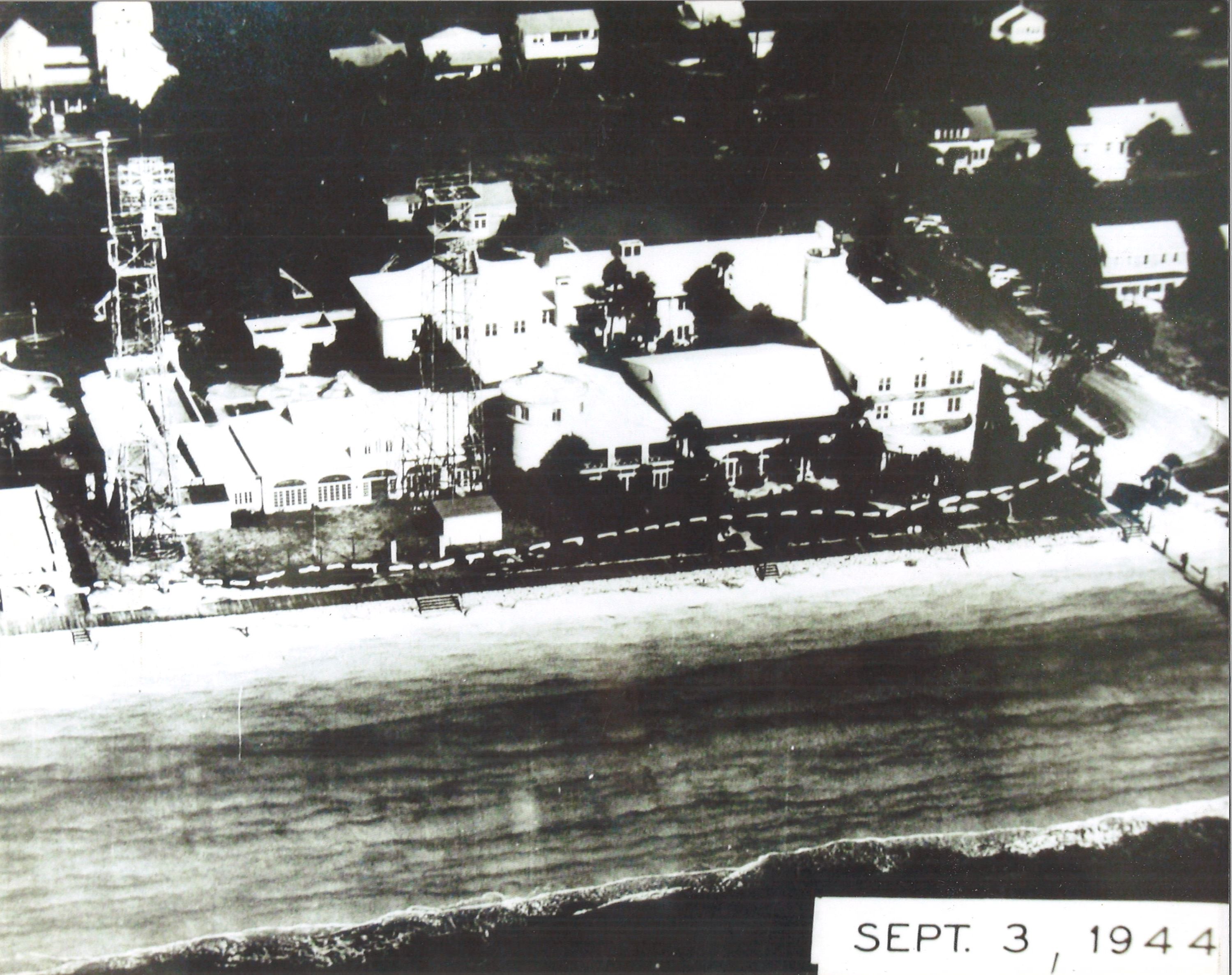 The King and Prince Hotel on the beach not far from the air station served as bachelor officers quarters for the students; with capacity greatly increased by installing multi tier bunk beds in each guest room. German prisoners of war did the cooking and serving for the student’s mess. The building at the far left was outfitted as a training CIC and was served by four radars on the towers in front of the hotel. The high, small antenna on the left tower serves a SG surface search radar and the large antenna on the same tower feeds a SK air search radar. The right tower holds a CXHR prototype three dimensional search radar and a Mark 12,22 fire control radar with height finder. Photo from: https://blog.kingandprince.com/index.php/tag/st-simons-island-radar-station/