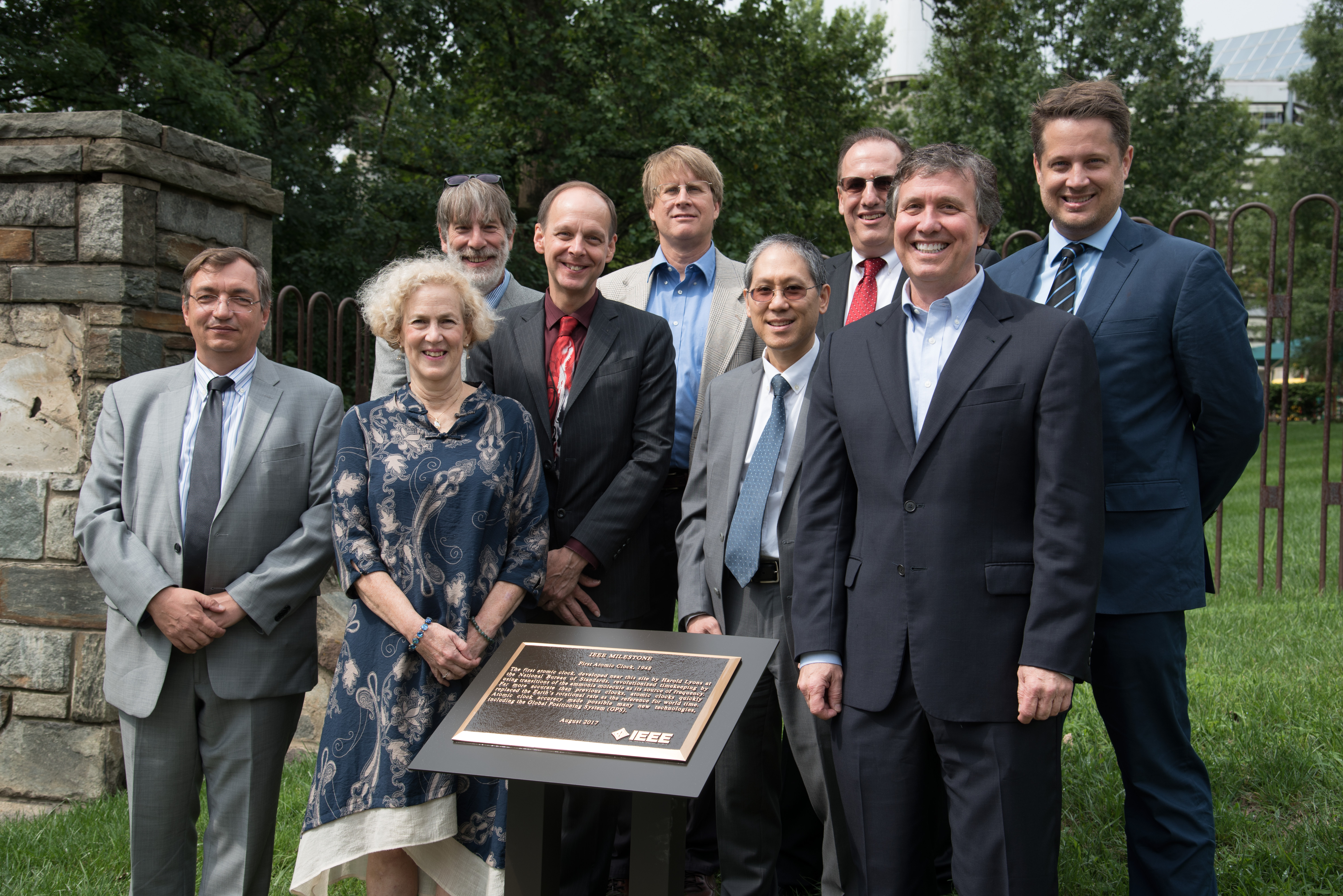 Dignitaries at dedication ceremony for the Atomic Clock. Sherry Lyons, the inventor's daughter is second from left in the front row