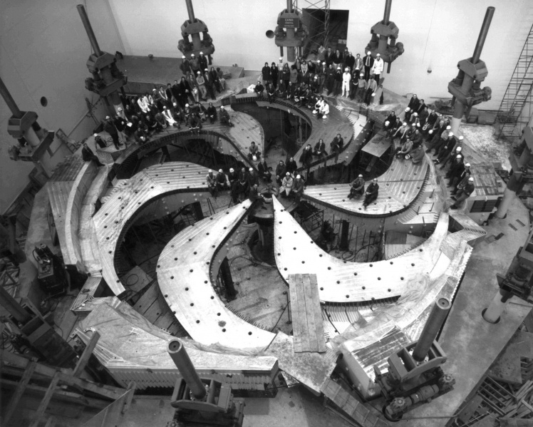 January 1972: TRIUMF staff gather on the lower six sectors of the cyclotron magnet.