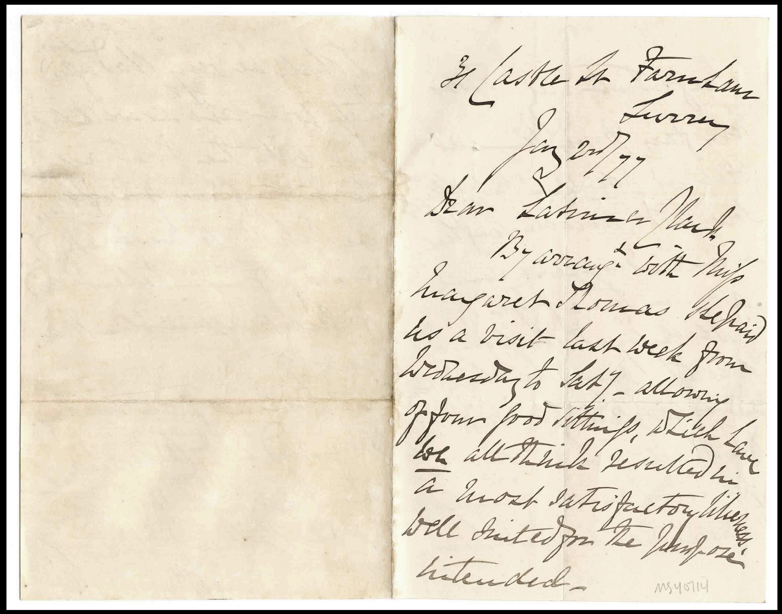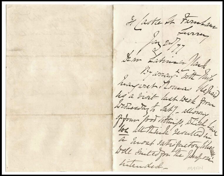 "By arrangement with Miss Margaret Thomas, she paid us a visit last week from Wednesday to Sat y (sic) - allowing of four good sittings which have we all think resulted in a most satisfactory likeness well suited for the purpose intended."