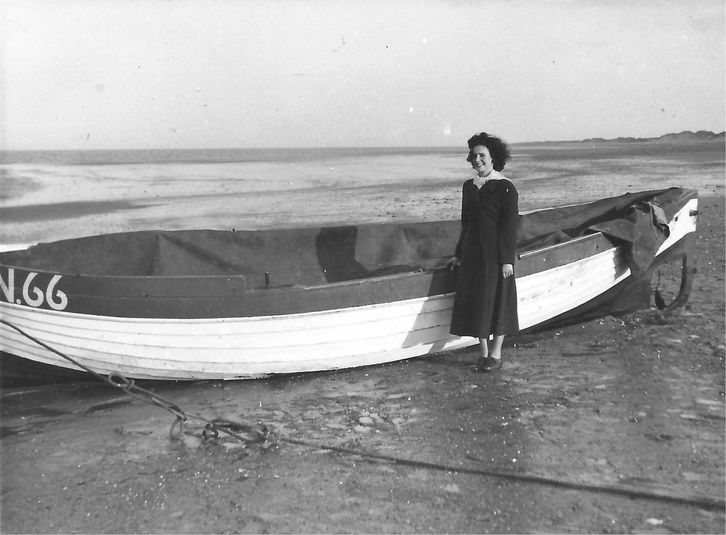 Crab Boat on beach at Chapel St. Leonards cerca 1952. Modelled by Marie. Probably belonged to Frank Stow. Photographer M. S. P. Lucas. No restrictions on use.