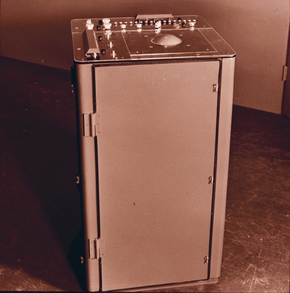 Shows the trackball interface, used in DATAR and mounted in one of the system consoles.This console was part of the 1953 sea trials of DATAR