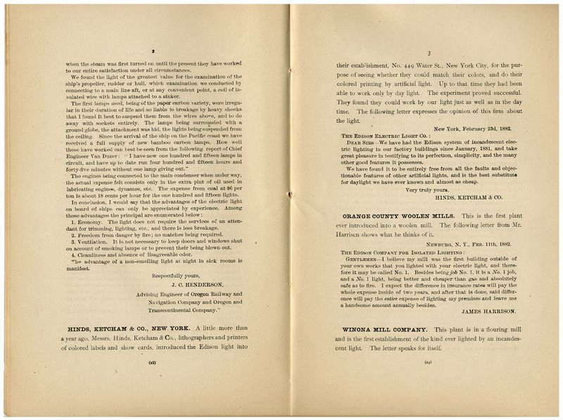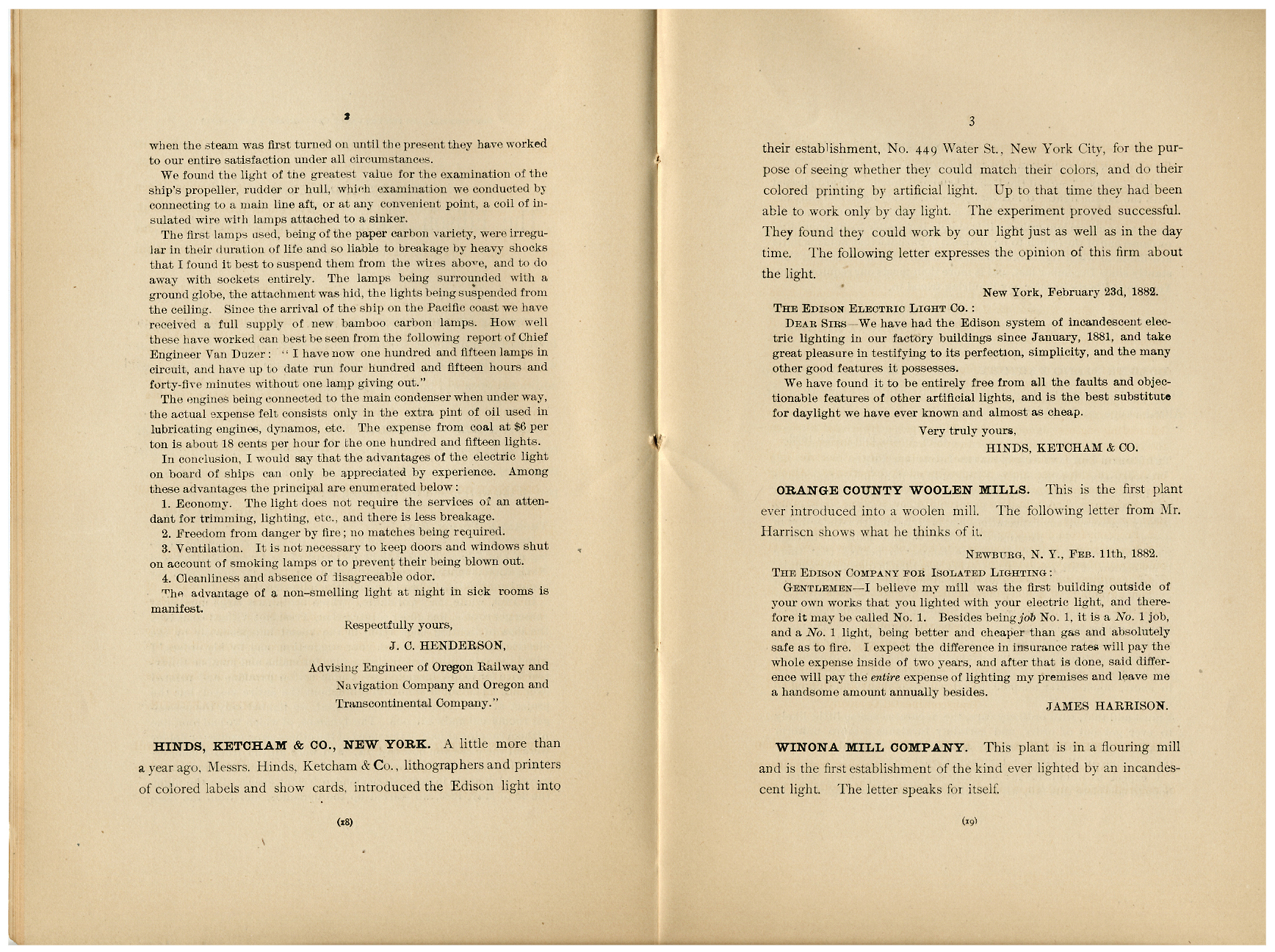 "New York, February 23, 1882. THE EDISON ELECTRIC LIGHT CO; - DEAR SIRS - - We have had the Edison system of incandescent electric lighting in our factory buildings since January, 1881, and take great pleasure in testifying to its perfection, simplicity, and the many other good features it possesses.