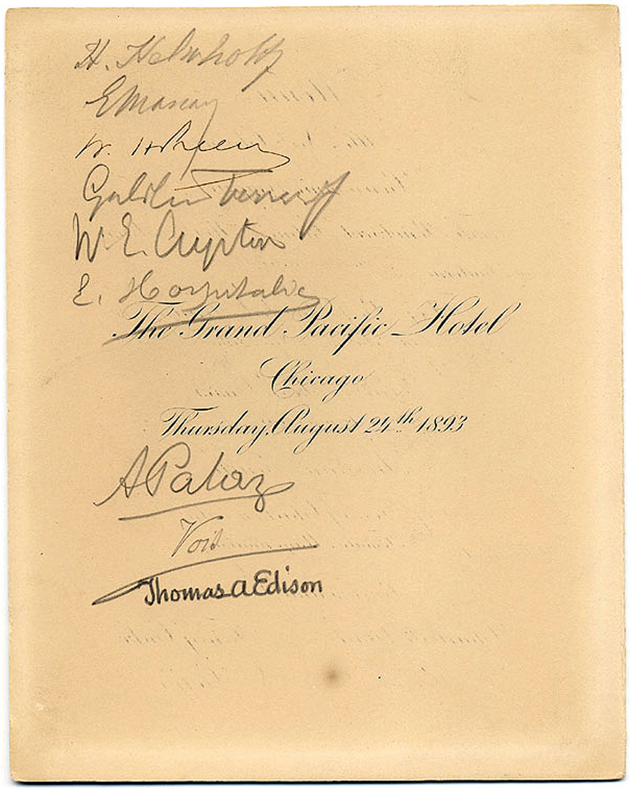 Card is printed on stiff card stock measuring 5 1/2" x 7" in size. Autographed by several prominent individuals in the electrical world of the day. Participant attendees bearing their signatures include Thomas A. Edison himself, and Elihu Thomson - co-founder of the Edison General Electric Company with Edison. Other prominent attendee signatures include Hermann von Helmholtz.