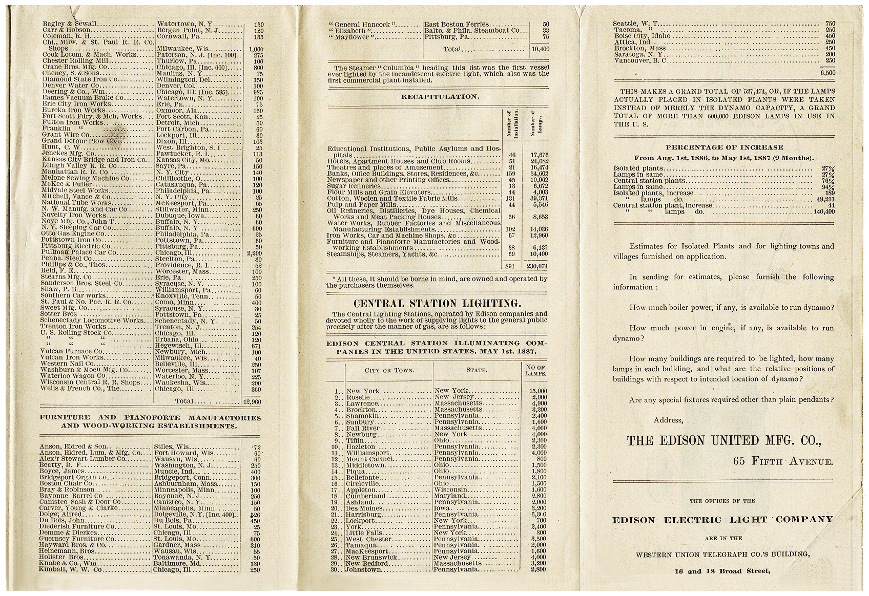 This 1887 Edison United Manufacturing Company and allied companies 28 leave sectional fold-out advertising brochure was located in France and sections of it were scanned by archivist, historian and author Richard Warren Lipack.