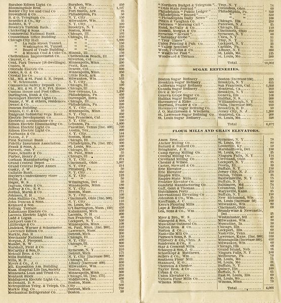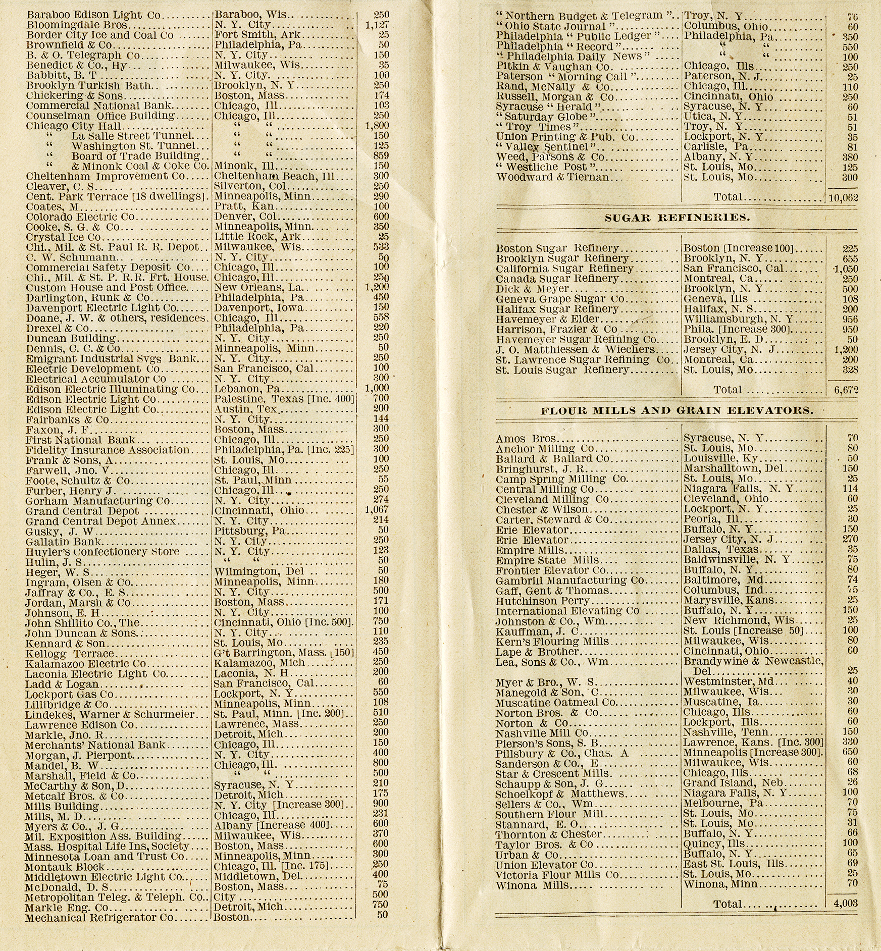 The accompanying illustration is a sample portion list of names and locations of both private "isolated plant" and also public "central station" electric dynamo installations across the United States and the capacity number of incandescent lamps fed by each and all.