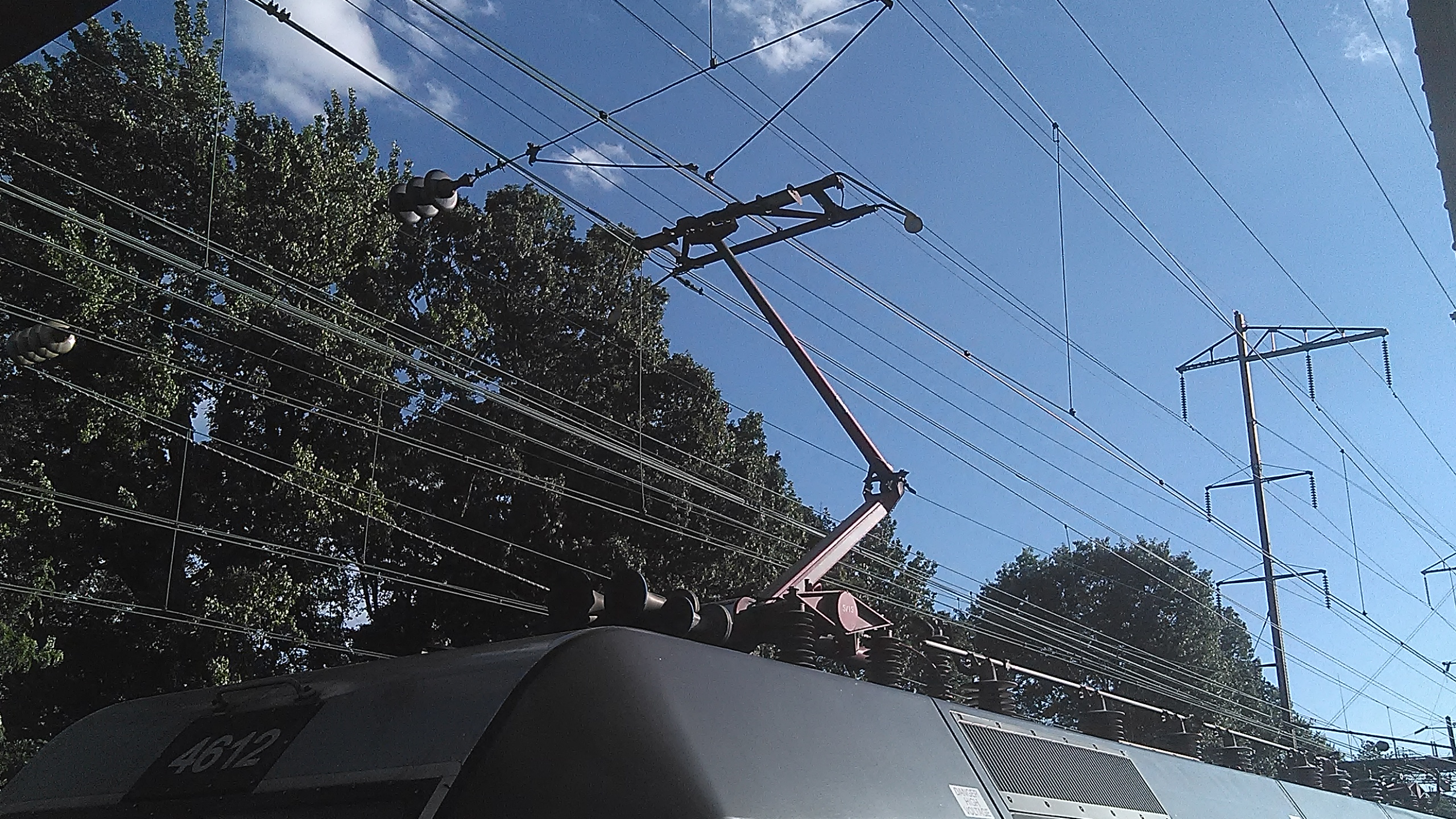 The pantograph on a Bombardier ALP-46 electric locomotive in service with New Jersey Transit, August 2017. Photograph courtesy of Robert Colburn, IEEE History Center staff
