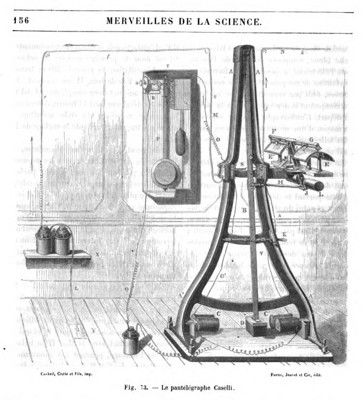 The French telegraph administration operated the world’s first fax service in 1865 with Abbé Caselli’s pantelegraph. Louis Figuier, Les Merveilles de la Science Vol. 2 (Paris: Librarie Furne, Jouvet et Cie, 1870)