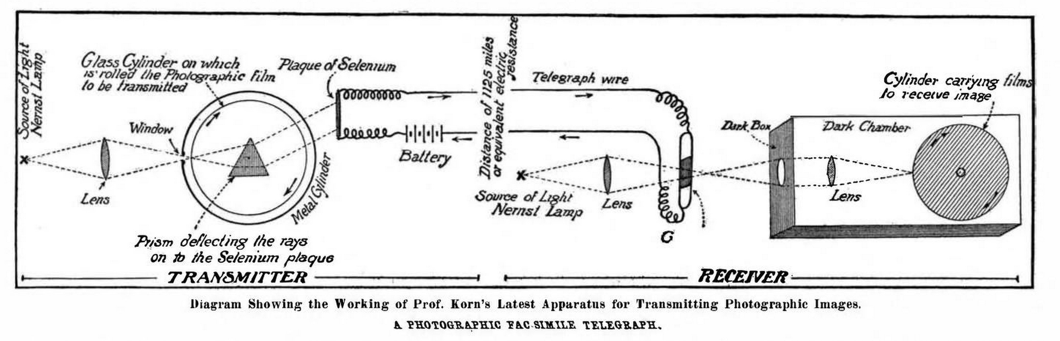 | current | 12:50, 17 September 2014 | 2,172 × 699 (519 KB) | Administrator7 (talk | contribs) | This schematic of Arthur Korn’s 1907 teleautograph depicts the basics of facsimile: scanning, transmitting, and reproducing an image. Instead of physical scanning, a beam of light scanned the image in Korn’s selenium-based system, which used electric |
