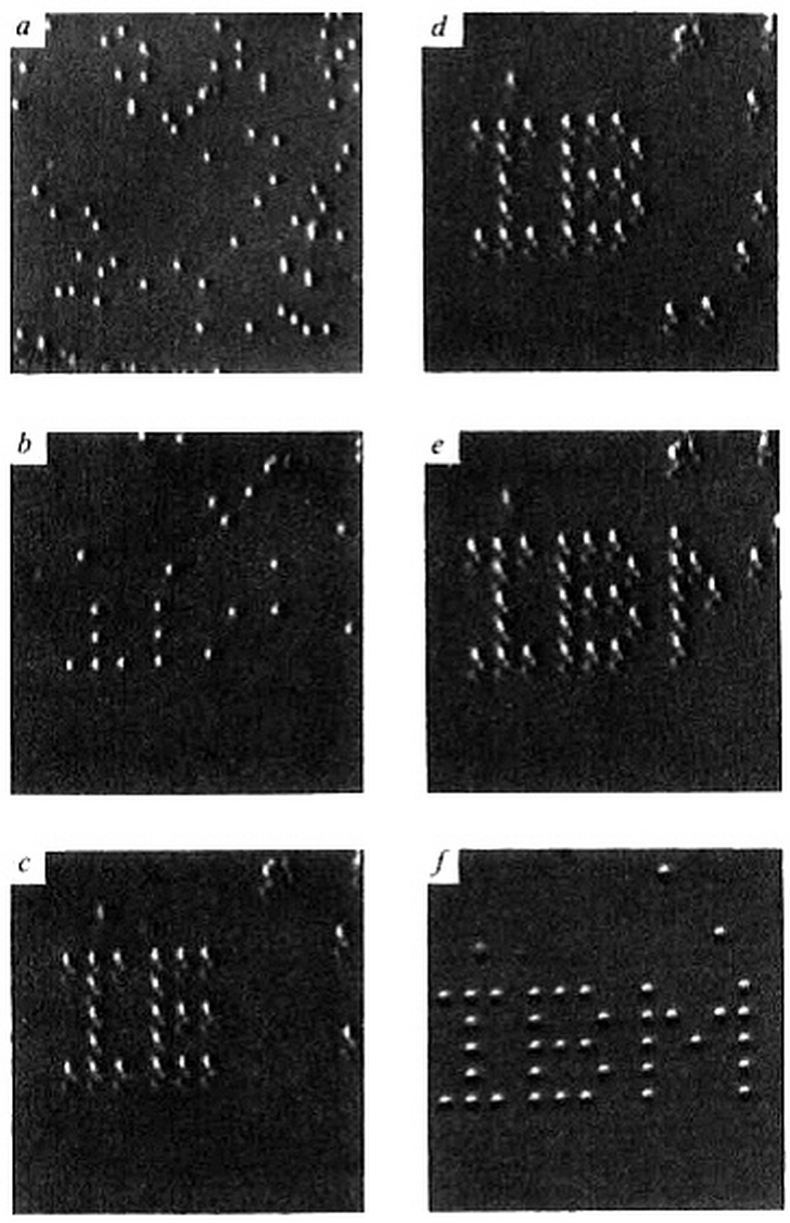 Series of images taken in 1990 during Don Eigler and Erhard Schweizer's arrangement of xenon atoms on a nickel (110) surface, beginning with the dosing of the crystalline surface with Xe atoms. Each atom is 1.6 Angstroms high; each letter measures 50 A from top to bottom. Courtesy IBM Archives.