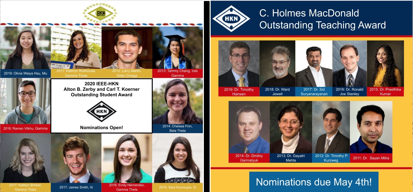 Graphics showing winners of the HKN Outstanding Student and Outstanding Teaching Awards for 2011-2019. Call for nominations 2020.