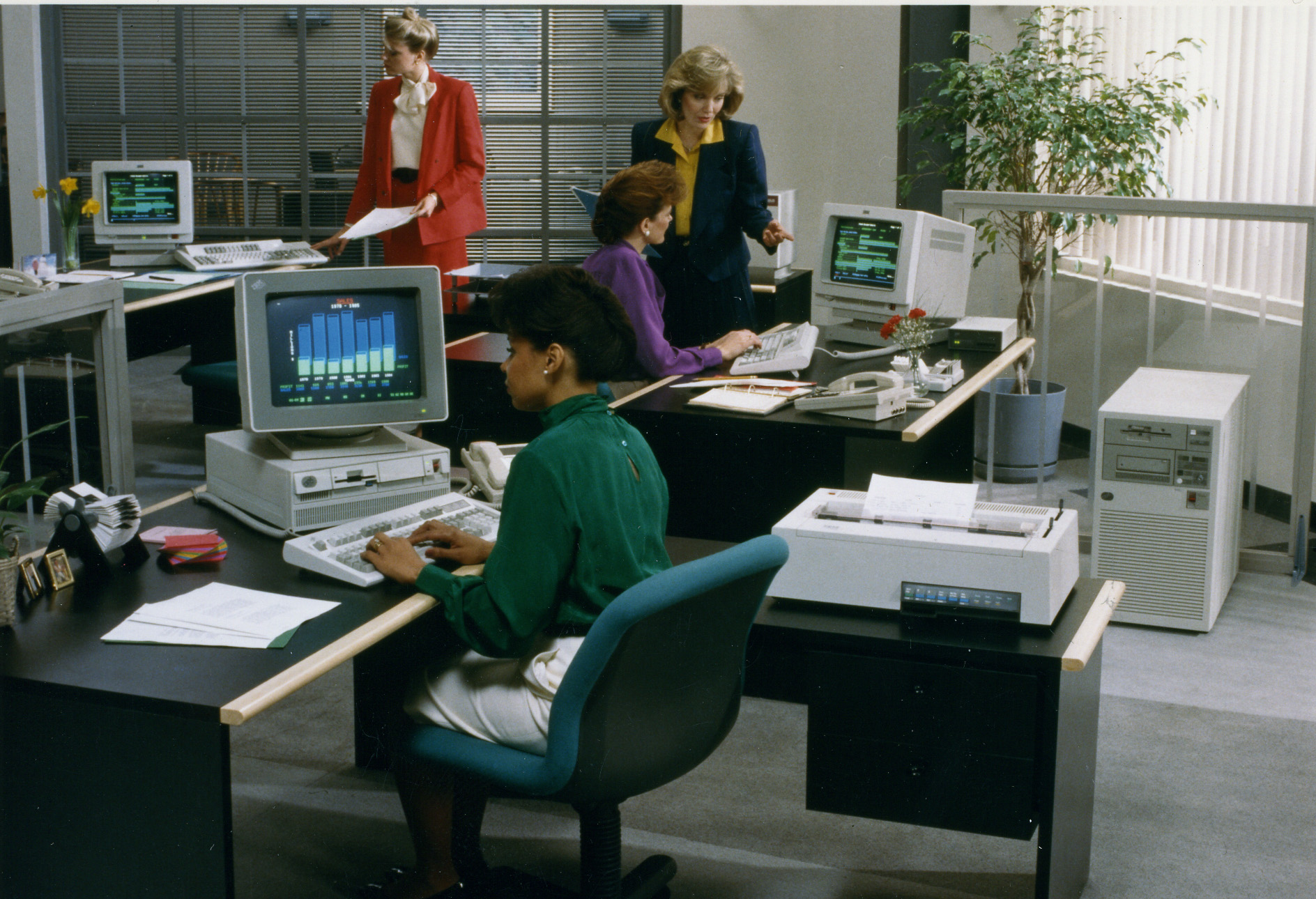 IBM promotional photo of office staff working on an IBM AS400 Model 10 network, c. 1989. Courtesy IBM Archives