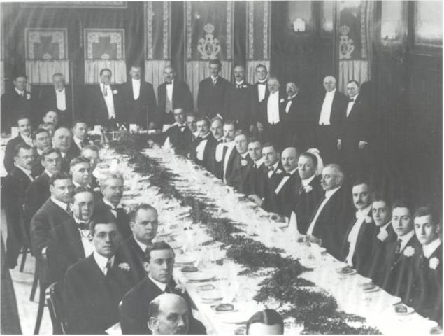 George W. Pierce, Harvard; Dr. Karl Braun; John Stone Stone, IRE president and toastmaster; Prof. Jonathan Zenneck; Dr. Lee De Forest; Nikola Tesla; Dr. Fritz Lowenstein; Dr. Albert N. Goldsmith, College City of New York; Judge Mayer; Dr. Karl G. Frank, Atlantic Communication Company; Edward J. Nally, VP, general manager, Marconi Wireless Telegraph Company of America; Robert H. Marriott, government radio inspector
