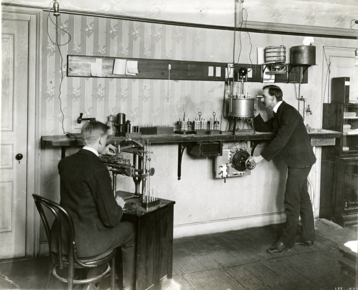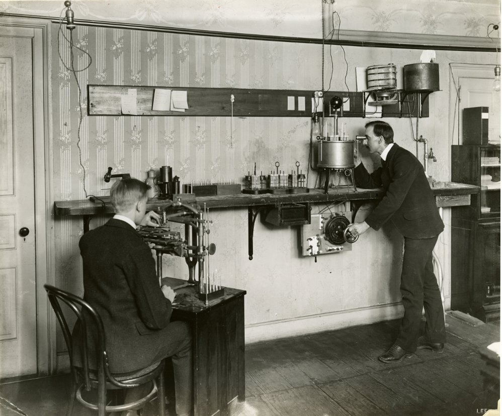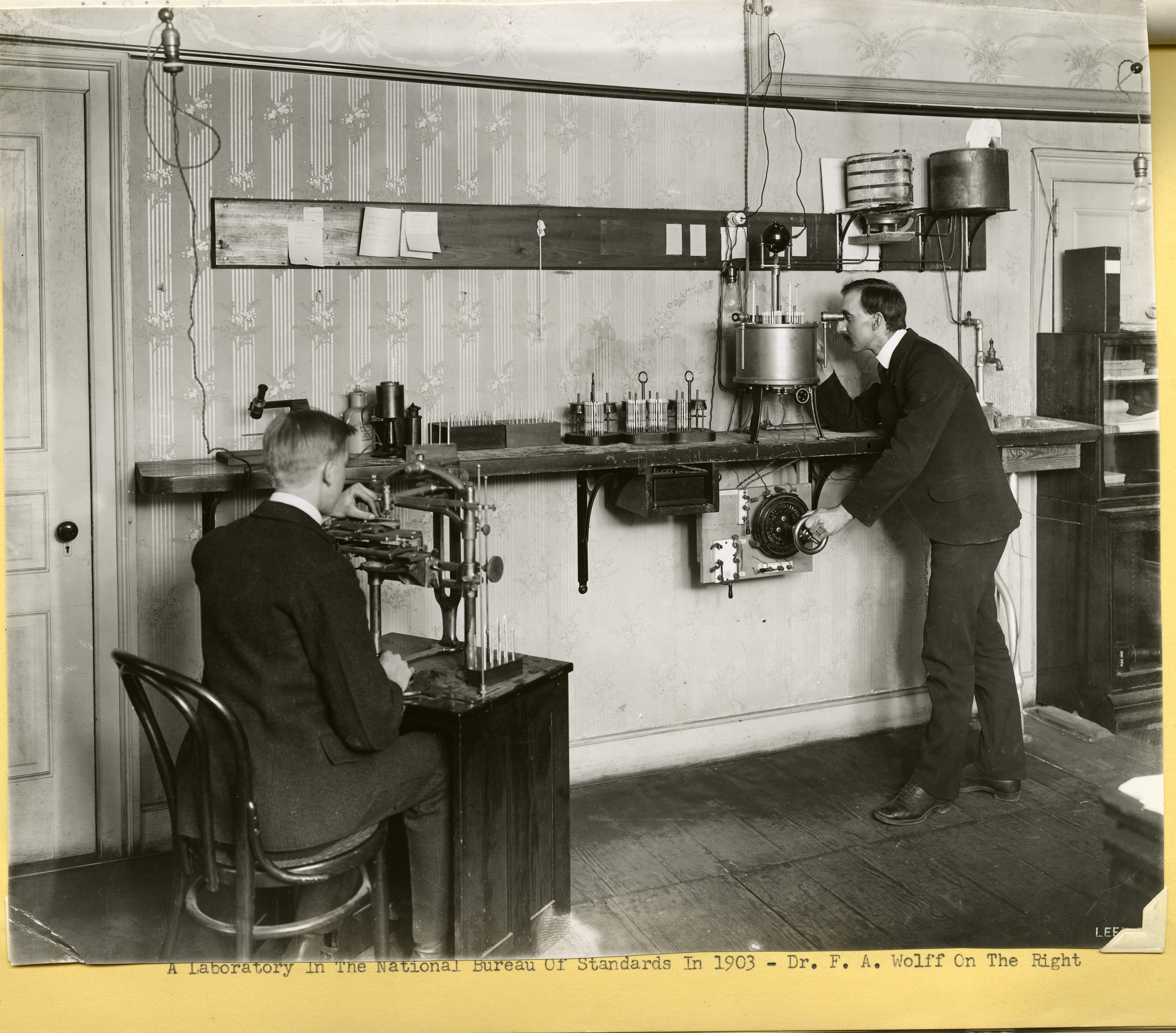 Dr. Wolff, the man at the right, is operating an oil bath maintained at a particular temperature while observing a temperature gauge graduated to tenths of a degree in order to measure the temperature response of several Weston cells, used to calibrate voltmeters at the time. His colleague may be crafting the mercurial thermometers used in the experiment,and undoubtedly resting his eyes for the next batch of measurements he was to take following Dr. Wolff. Apparently Dr. Wolff was one of the first to make use of least squares fitting to produce a calibration curve, a result of this experiment.