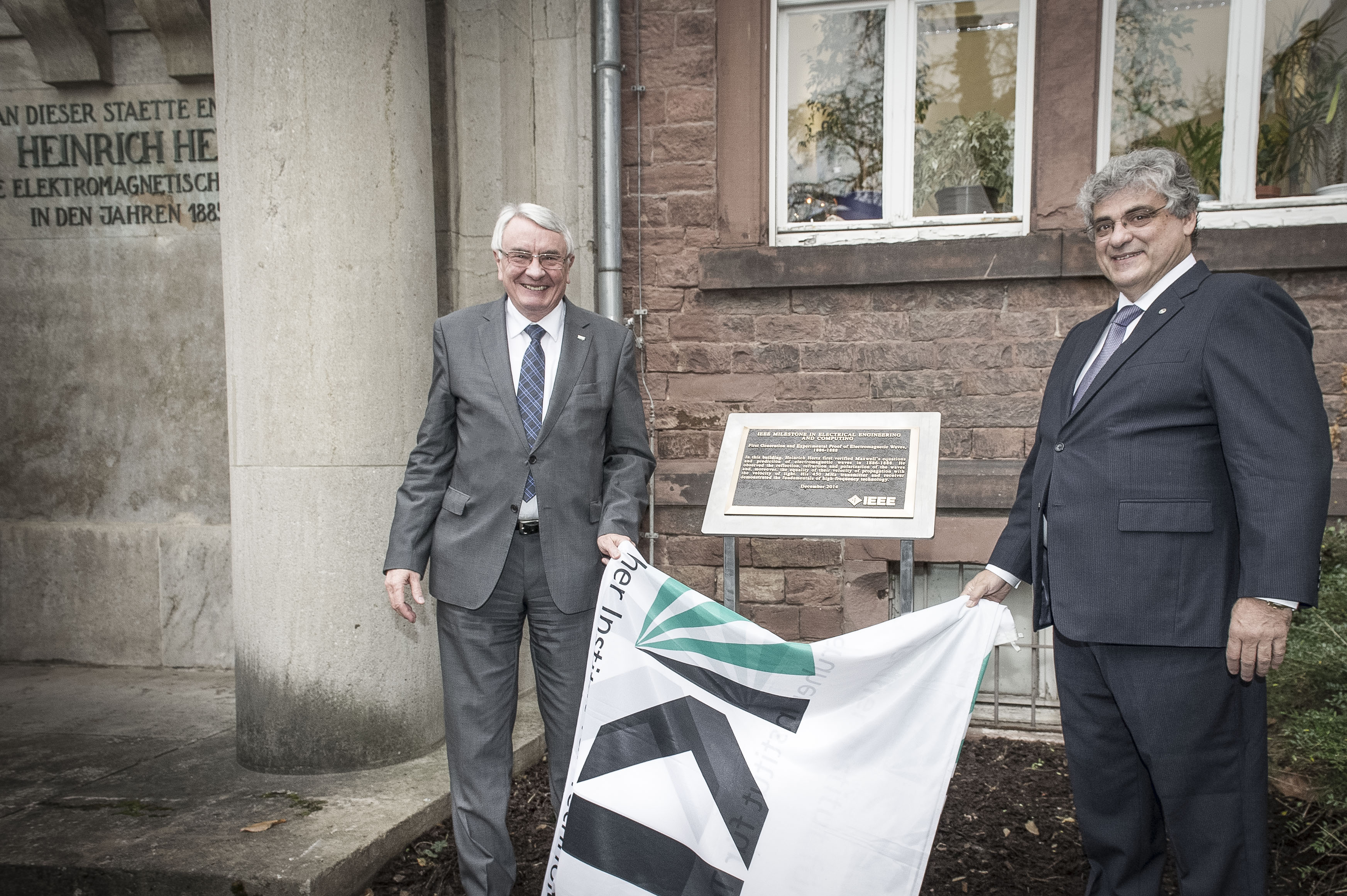Detlef Lohe (Karlsruhe Institute of Technology President) and Roberto de Marca (IEEE President, 2014) unveil the IEEE Milestone plaque honoring Heinrich Hertz's experimental proof of electromagnetic waves.