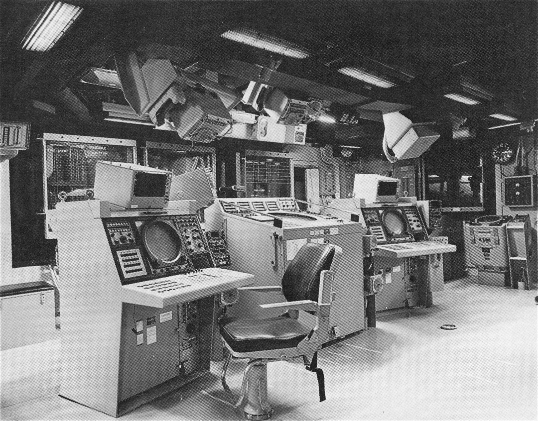 Combat Information Center of the guided Missile Frigate USS Curts. An AN/UYA-4 operations summary console is flanked by two standard UYA-4 12-inch NTDS PPI consoles. U.S. Navy photo